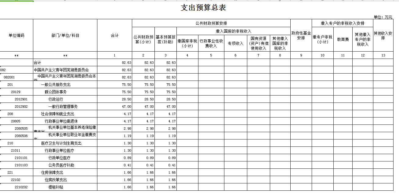 按照综合预算管理的原则,中国共产主义青年团芜湖县委员会所有收入和支出均纳入部门预算管理。中国共产主义青年团芜湖县委员会2018年收支总预算82.63万元,收入来源于财政拨款收入。支出包括:一般公共服务支出、社会保险与就业支出、医疗卫生支出和住房保障支出。