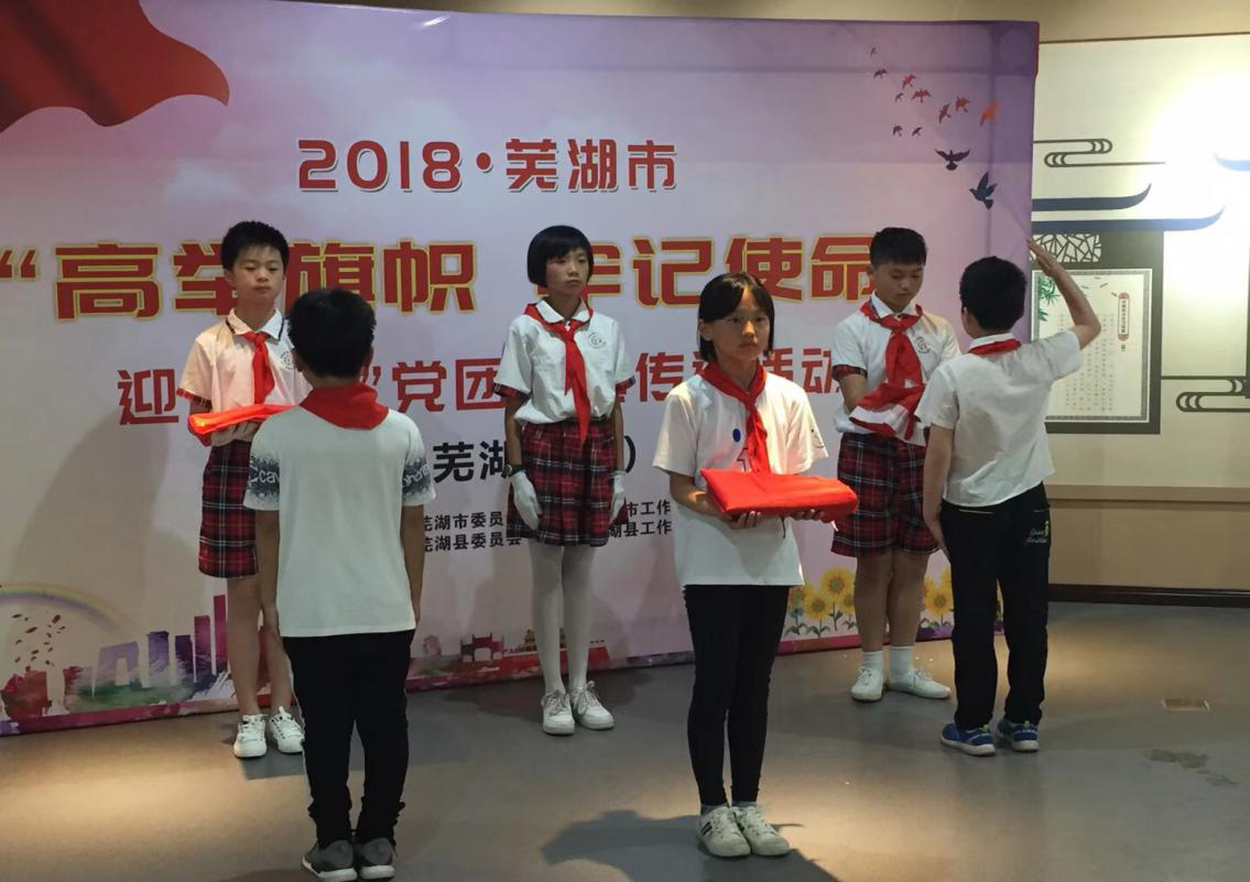 本次传递活动主要分为传旗仪式和实践体验两个部分。活动中,首先展示了由经开区少工委传递而来的党团队三面旗帜,紧接着三名党团队优秀代表在旗帜下为大家讲述如何为党团队旗争光的故事。最后,在领誓人的带领下,全体少先队员共同重温了入队誓词。宣誓后,芜湖县的少先队员代表将鲜红的党团队旗郑重地传递到了无为县的三名少先队员手中。