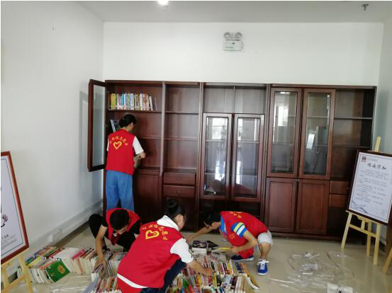 志愿者们不顾高温酷暑,发扬“奉献、友爱、互助、进步”的志愿服务精神,对各阅读点的图书进行了重新整理、分类、上架,并将桌椅摆放整齐。同时为24小时自助图书馆增加期刊200册、其它阅读点各增加了120册。